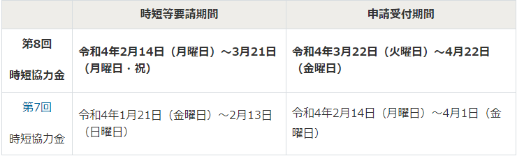 令和4年2月14日(月)~令和4年3月21日(月・祝)において協力要請(第8回)に全面的に応じたものとし、申請日においても、倒産、廃業又は休業(時短等要請に基づくものを除く)をせずに営業活動を行っている事業者が協力金の交付対象となります。