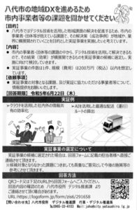 ・八代市ではデジタル技術を活用した地域課題の解決を促進するため、市内の事業者・団体等が抱えている課題で、その解決策(成功事例)が地域や、業界に横展開されていくことを目的とした実証事業を実施したいと考えています。